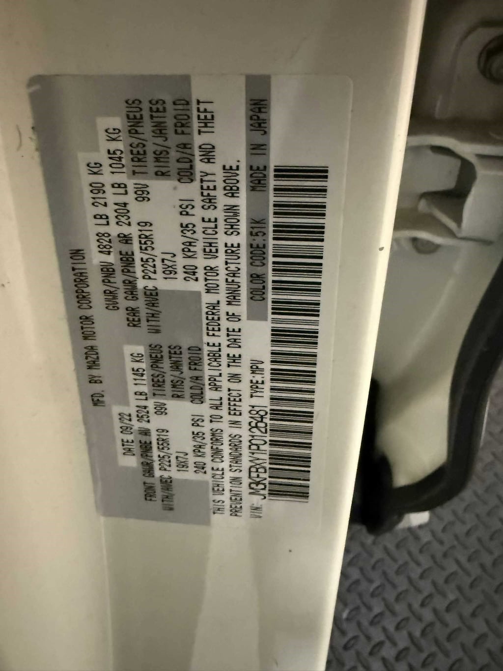 - Rear tires: 225/55VR19.0