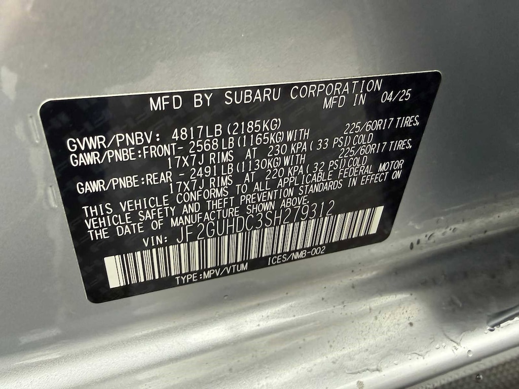 BSD/RCTA & ALL WTHR PKG & PWR DR. SEAT & PWR MOONRF automatic emergency steering, system off switch, BSD/RCTA detection indicator exterior power mirrors, rear radar detection sensors and lane change assist, Rear Cross-Traffic Alert (RCTA) System, off and malfunction warning indicator and audible vehicle detection warning, 10-Way Power Drivers Seat, 2-way lumbar support, Blind Spot Detection (BSD), All-Weather Package, Heated Power Exterior Mirrors, Dual-Mode Heated Front Seats, Windshield De-Icer Wipers, Power Moonroof, tilt up and internal retracting w/auto-open/close and laminated, UV and dark tint moonroof glass, AUTO-DIMMING MIRROR W/COMPASS & HOMELINK, CARGO COVER. Subaru Premium with Ice Silver Metallic exterior and Black interior features a 4 Cylinder Engine with 182 HP at 5800 RPM*.