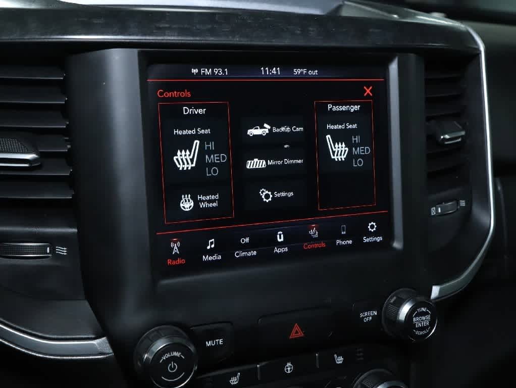 BIG HORN LEVEL 2 EQUIPMENT GROUP Radio: Uconnect 4 w/8.4 Display, Rear Window Defroster, ParkSense Front/Rear Park Assist w/Stop, Rear View Auto Dim Mirror, Power Adjustable Pedals, Rear Power Sliding Window, Rear Dome w/On/Off Switch Lamp, Glove Box Lamp, Power 4-Way Driver Lumbar Adjust, 115V Auxiliary Rear Power Outlet, Power 8-Way Driver Seat, 2 USB Full Function/Charge Only Media Hub, Heated Front Seats, Heated Steering Wheel, Foam Bottle Insert (Door Trim Panel), Class IV Receiver Hitch, Dampened Tailgate, Security Alarm, Black Premium Power Mirrors, Big Horn IP Badge, Remote Start System, SiriusXM Satellite Radio, 400W Inverter, Air Conditioning ATC w/Dual Zone Control, 115V Auxiliary Power Outlet, Universal Garage Door Opener, 2nd Row In Floor Storage Bins, Sun Visors, NIGHT EDITION Tires: 275/55R20 OWL All Season, Black Headlamp Bezels, Body Color Premium Power Mirrors, Body Color Door Handles, Exterior Mirrors Courtesy Lamps, Auto Dim Exterior Driver Mirror, Black Exterior Truck Badging, Anti-Spin Differential Rear Axle, Wheels: 20 x 9.0 Premium Paint/Polished, Exterior Mirrors w/Memory, Grille Surround 1 Black Texture 2 Black, Body Color Exterior Mirrors, Black Interior Accents, Dual Exhaust w/Black Tips, Power-Folding Mirrors, Body Color Front Bumper, Body Color Rear Bumper w/Step Pads, TRANSMISSION: 8-SPEED AUTOMATIC (850RE) (STD), ENGINE: 3.6L V6 24V VVT ETORQUE UPG I (STD).